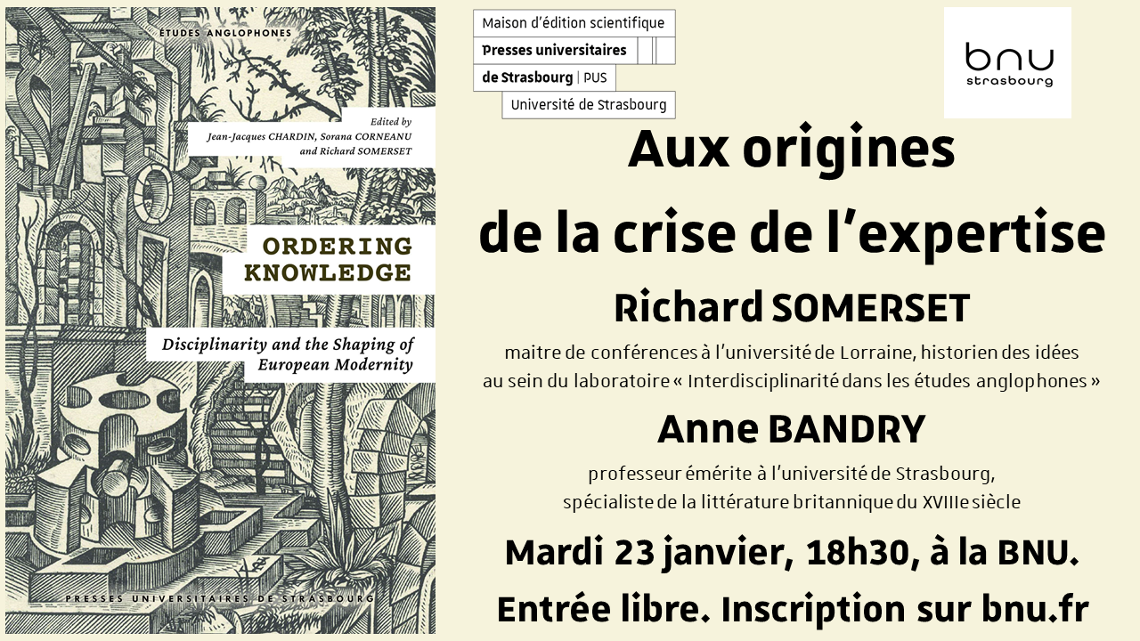 Pour cette première conférence Savoirs en partage de l'année, consacrée à l'histoire et la philosophie des sciences, le codirecteur du livre Ordering Knowledge. Disciplinarity and the Shaping of European Modernity dialoguera (en français !) avec Anne Bandry, ancienne doyenne de la faculté des Langues et spécialiste du XVIIIe siècle.