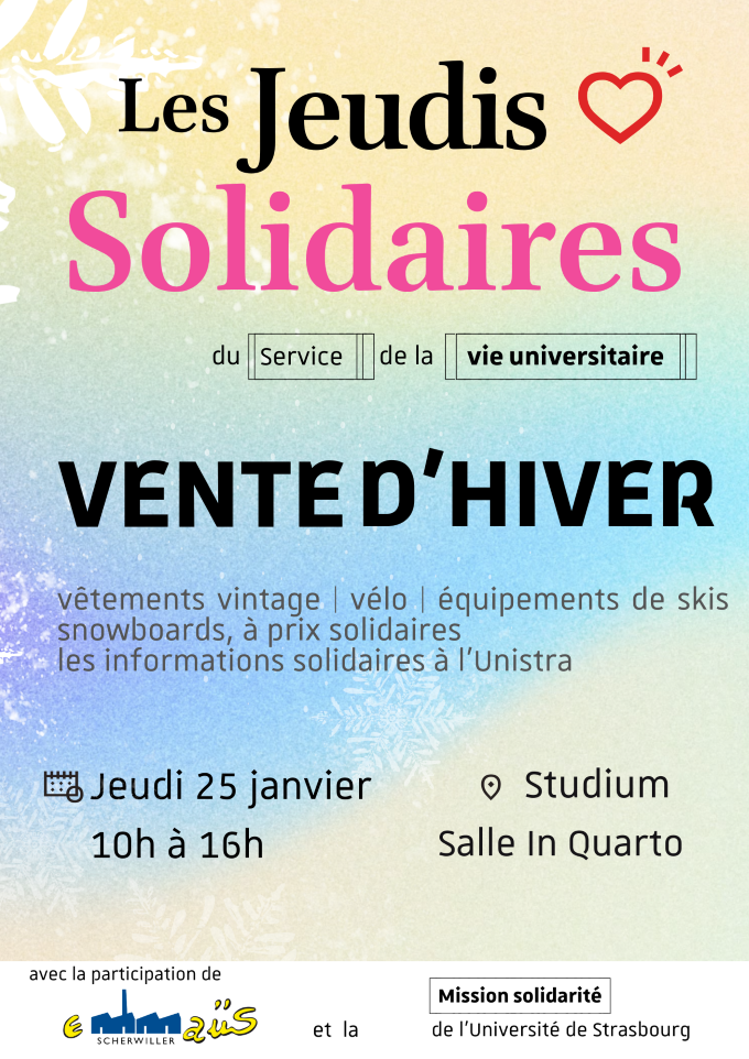A l'occasion des Jeudis solidaires, une vente d'hiver est organisée jeudi 25 janvier à partir de 10h au Studium sur le campus de l'Esplanade.