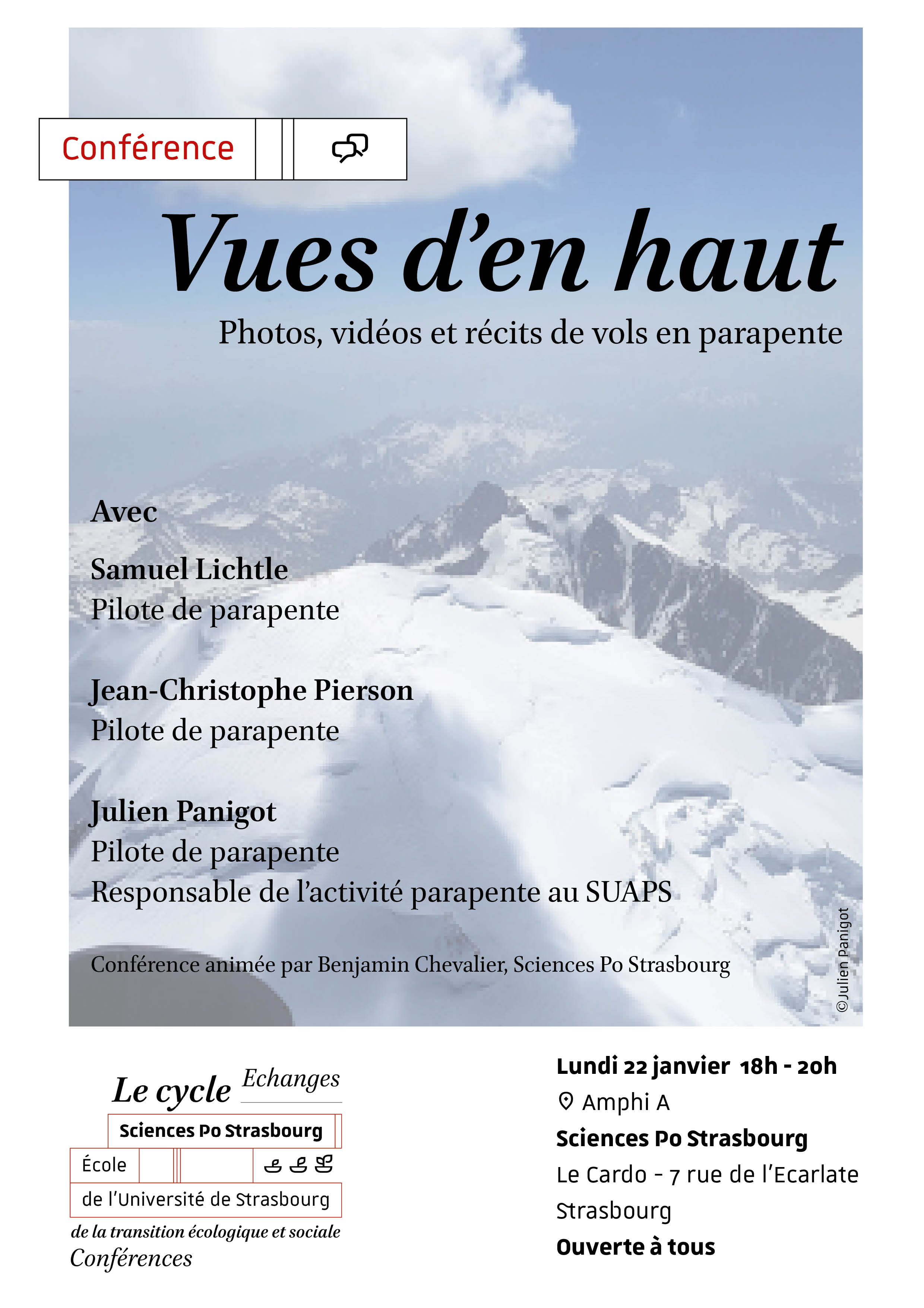 Dans le cadre du cycle de la transition écologique et sociale de Sciences Po Strasbourg, nous vous proposons une conférence intitulée « Vues d'en haut » avec des photos, vidéos et récits de vols en parapente. Elle aura lieu lundi 22 janvier à 18h au Cardon sur le site de l'ancien hôtpital civil à Strasbourg, avec :