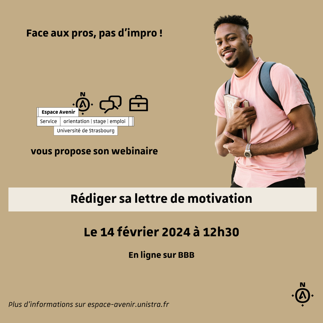 Un webinaire intitulé « Rédiger sa lettre de motivation » aura lieu mercredi 14 févier à 12h30.