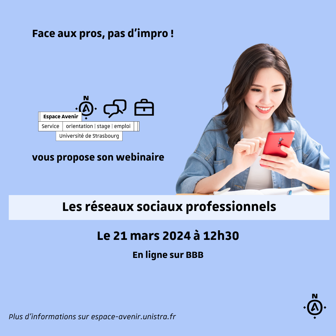 Un webinaire intitulé « Réseaux sociaux professionnels : maximiser sa recherche d'emploi / stage » aura lieu jeudi 21 mars à 12h30.