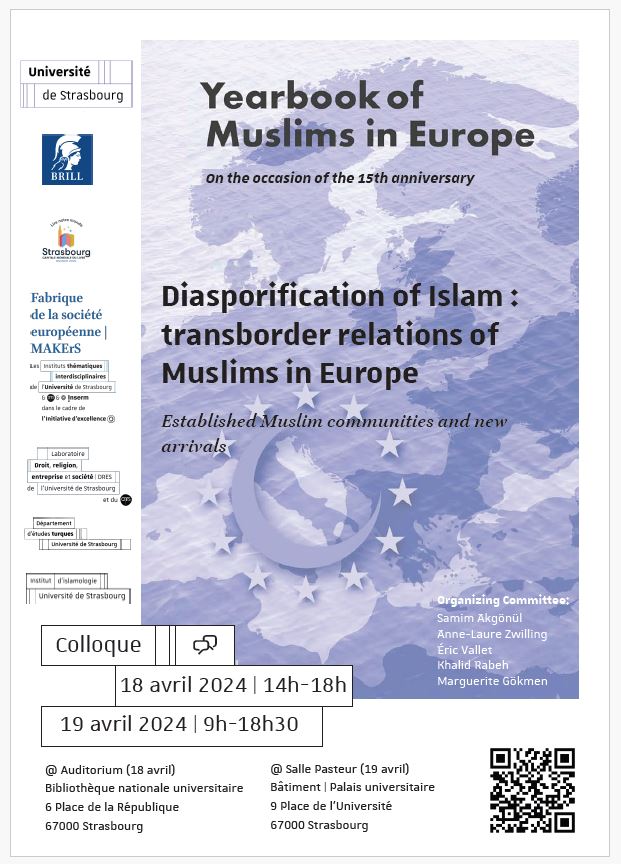 À l'occasion du 15e anniversaire du Yearbook of Muslims in Europe publié par Brill, le Centre de Recherche DRES UMR 7354, le Département d'Études turques de l'Université de Strasbourg ainsi que l'Institut thématique interdisciplinaire Makers et l'Institut d'Islamologie de l'Université de Strasbourg organisent un colloque international sur la diasporification de l'Islam en Europe les 18 et 19 avril, à la Bibliothèque Nationale Universitaire (le 18 après-midi) et au Palais Universitaire le 19 (toute la journée).
