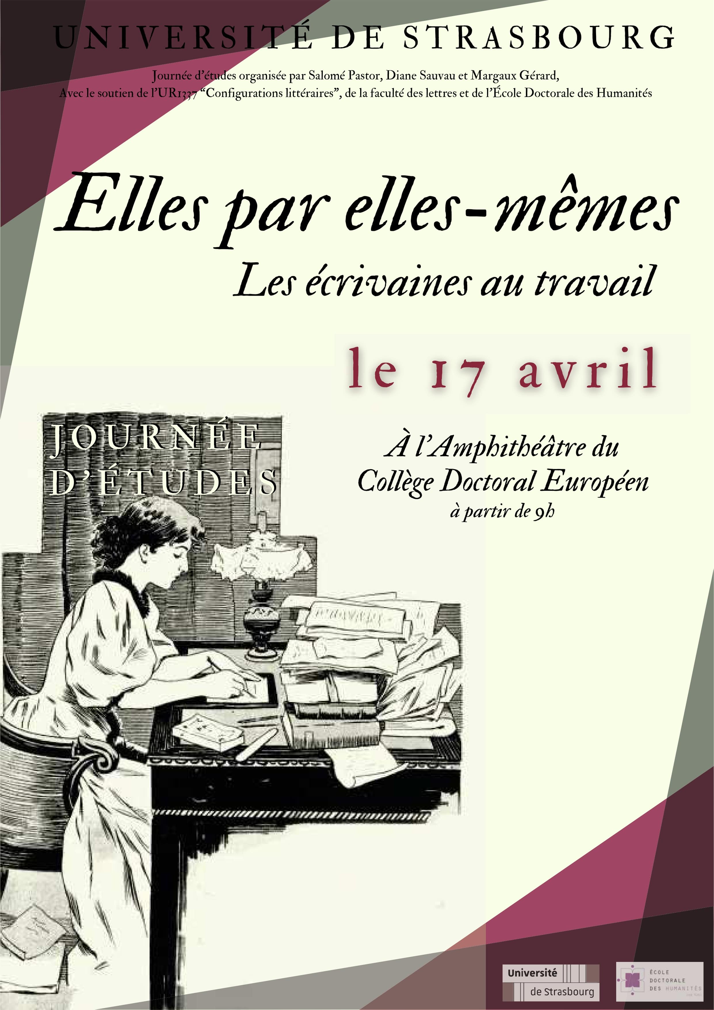 Mercredi 17 avril, à l'amphithéâtre du Collège Doctoral Européen, aura lieu une journée d'études organisée par Diane Sauvau, Margaux Gérard et Salomé Pastor. Cette journée, intitulée « Elles par elles-mêmes : les écrivaines au travail », sera l'occasion de (re)découvrir des autrices et de leur laisser la parole à elles, en tant que femmes et écrivaines, afin de comprendre les discours qu'elles portent sur leur statut et leurs liens à la littérature. Est-ce pour elles un travail, une vocation, un passe-temps ou autre chose encore ? Pourquoi écrivent-elles ? Quelles représentations d'elles-mêmes, en tant qu'écrivaines, ces femmes donnent-elles ? Afin d'éclairer ces questions, des autrices comme Françoise de Graffigny, Rachilde ou encore Claude Cahun retiendront notre attention, et nous aurons en outre l'occasion d'entendre les témoignages de Danièle Henky et Michèle Finck.