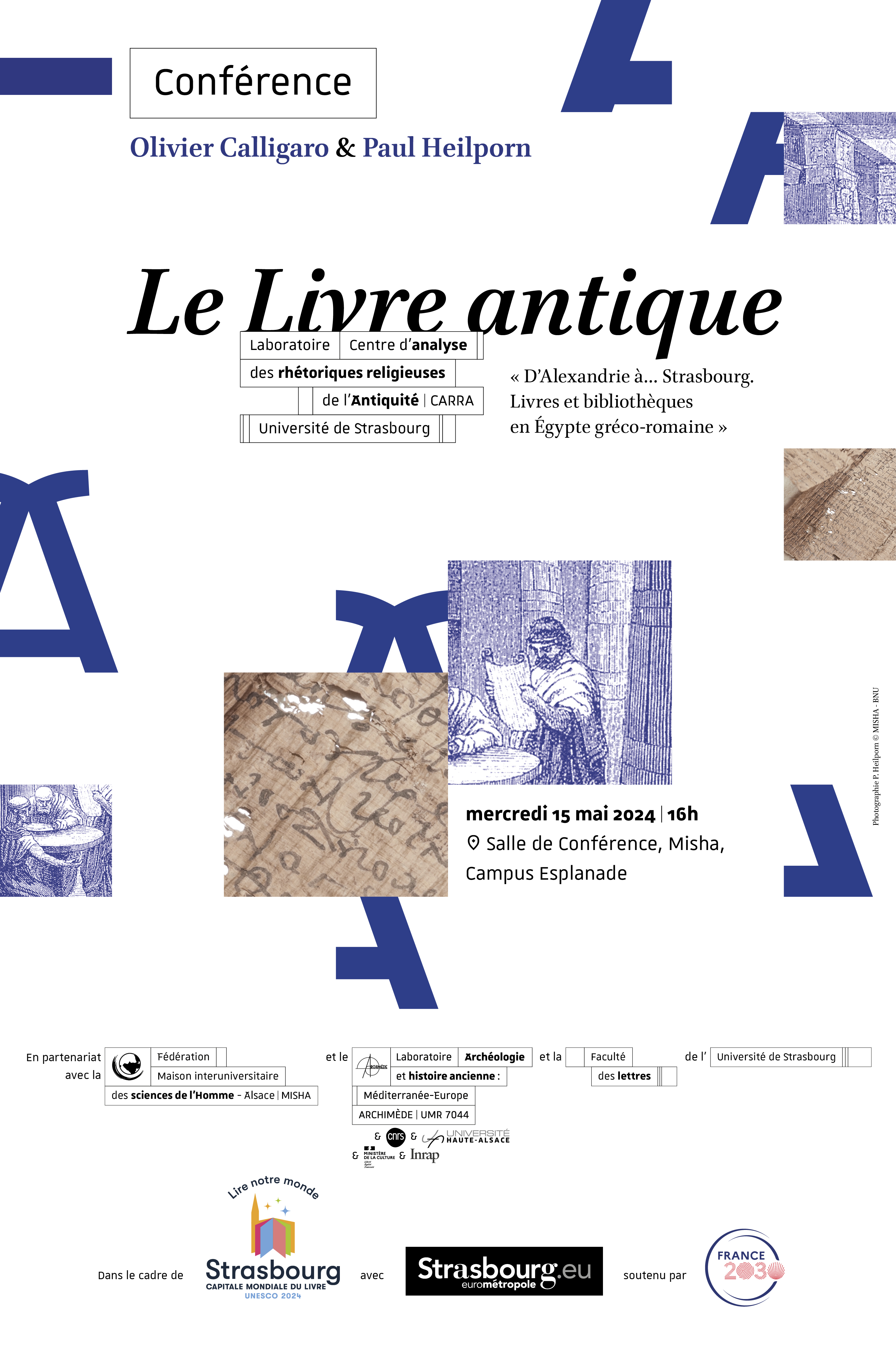 Une conférence grand public intitulée « D’Alexandrie à… Strasbourg. Livres et bibliothèques en Égypte gréco-romaine » aura lieu mercredi 15 mai à 16h à la Maison interuniversitaire des sciences de l'Homme - Alsace (Misha).