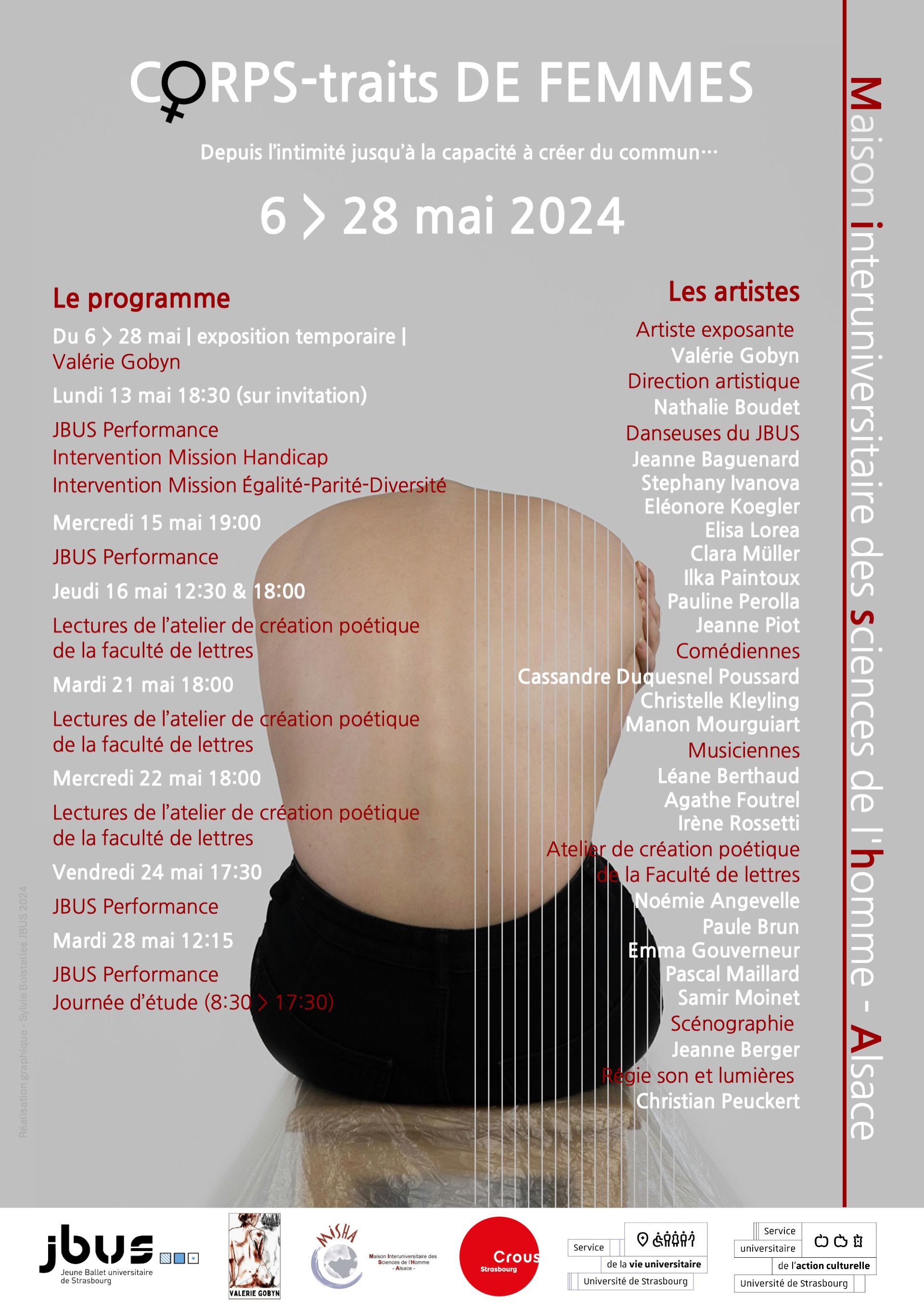 La rencontre du Jeune Ballet universitaire de Stras-bourg avec l’artiste plasticienne Valérie Gobyn a été le point de départ d’une réflexion nourrie du désir de mener en commun une aventure poétique, une expé-rience artistique dont l’interface sensible serait le corps de la Femme exprimé dans des parcours de vie singuliers. De ces regards artistiques croisés est né un projet fusionnel, une exposition –performance, « Corps - Traits de femmes »