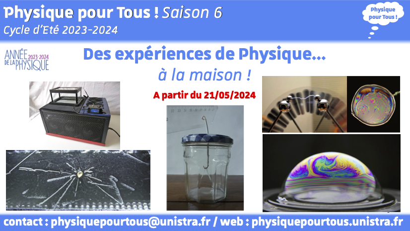 Cycle d'Eté « Des expériences de Physique à réaliser chez soi », proposé par un collectif IPHC/ICS (Pierre Van Hove, Thierry Pradier, Thierry Charitat, Pierre Müller) à partir du mardi 21 mai 2024 pour 4 cours (1 cours par semaine)