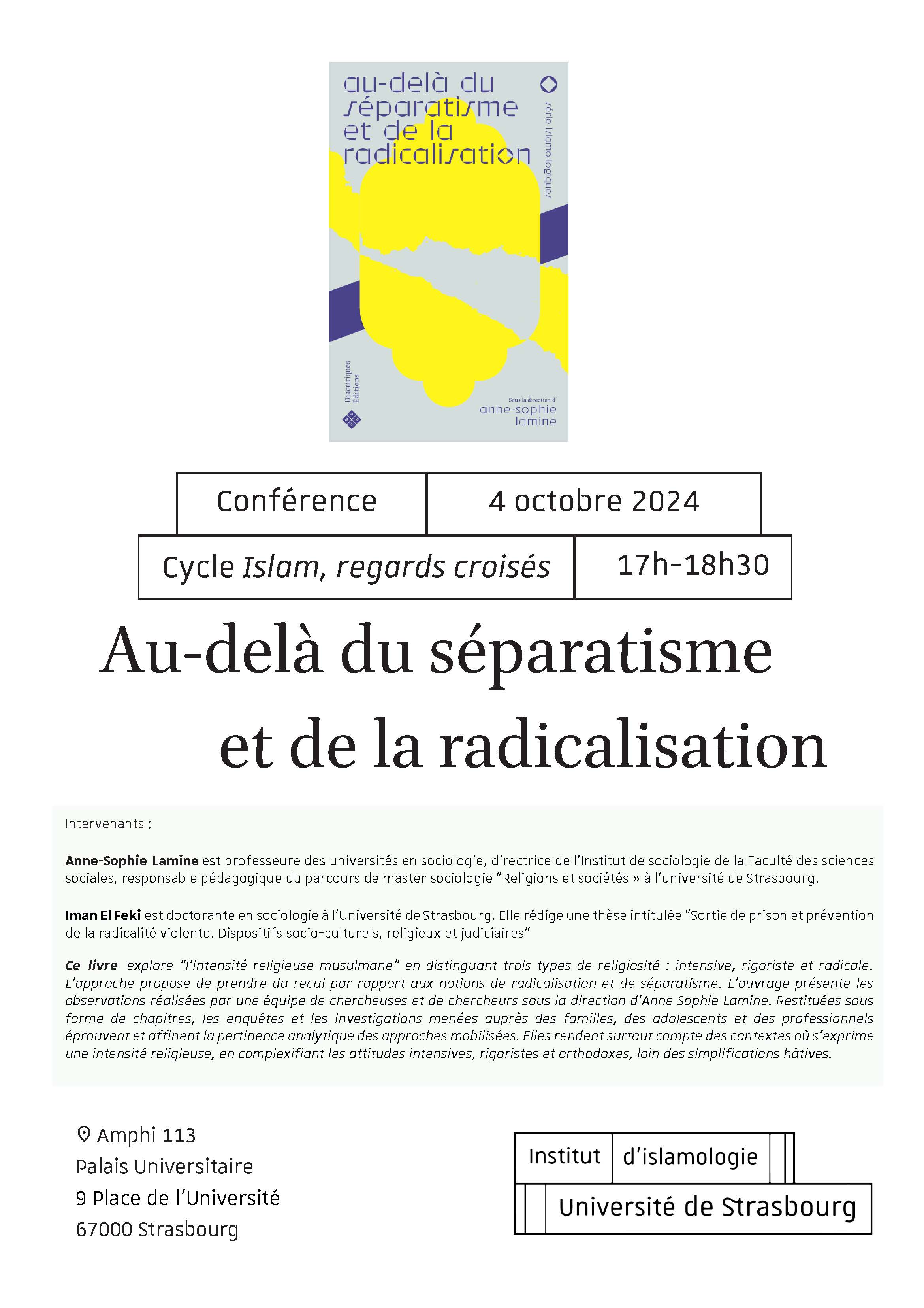 Dans le cadre du cycle de conférences Islam, regards croisés, l'Institut d'islamologie de l'université de Strasbourg organise vendredi 4 octobre de 17h à 18h30 une conférence autour du livre intitulé « Au-delà du séparatisme et de la radicalisation » avec Anne-Sophie Lamine (Professeure des Universités en sociologie) et Iman El Feki (doctorante)