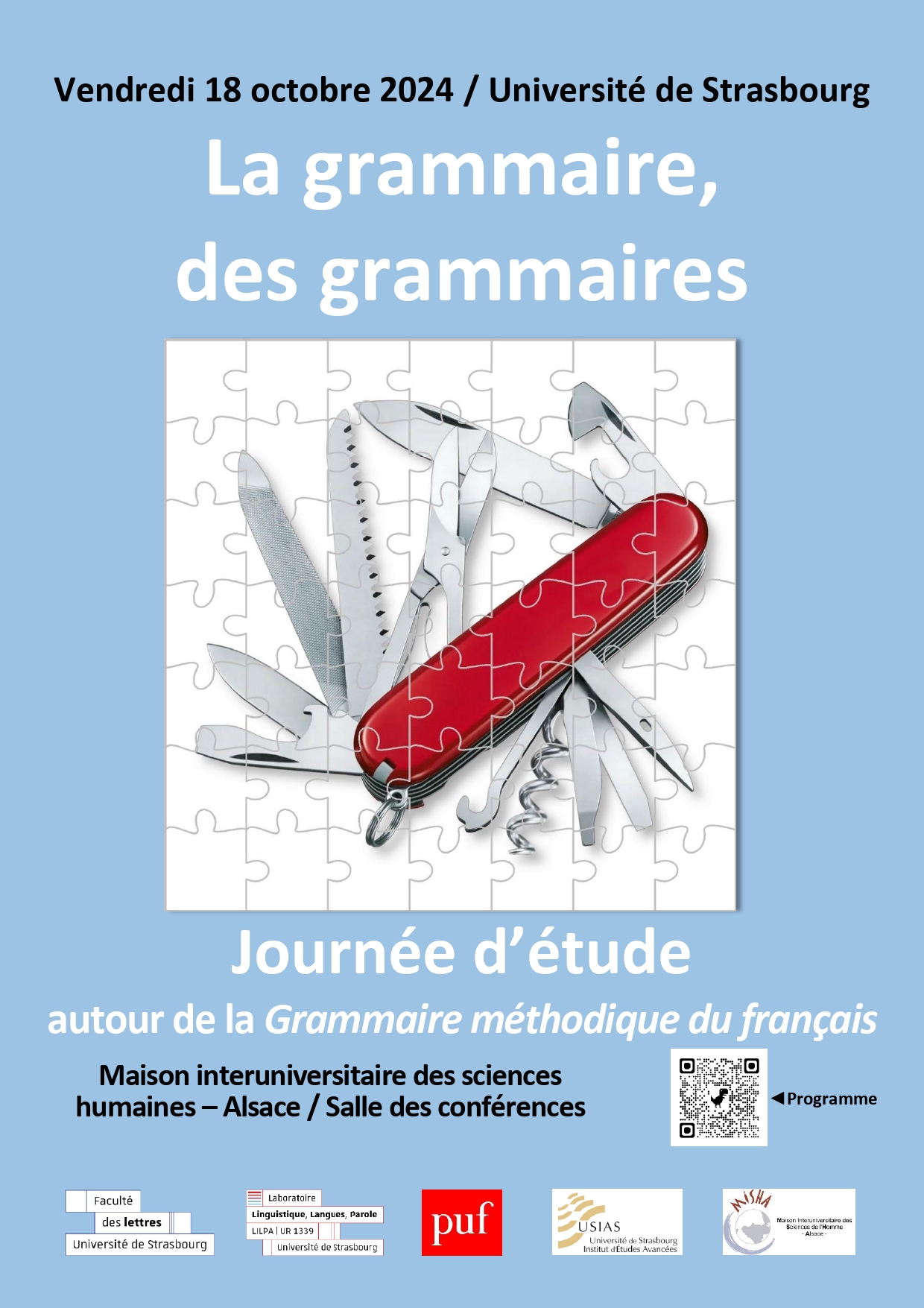 Cette journée d’études La grammaire, des grammaires est organisée par Jean-Christophe Pellat, Jean-Paul Meyer, Martin Riegel et Georges Kleiber, avec le soutien de la faculté des Lettres, de LiLPa, de l’USIAS, des Presses Universitaires de France et de la MISHA.