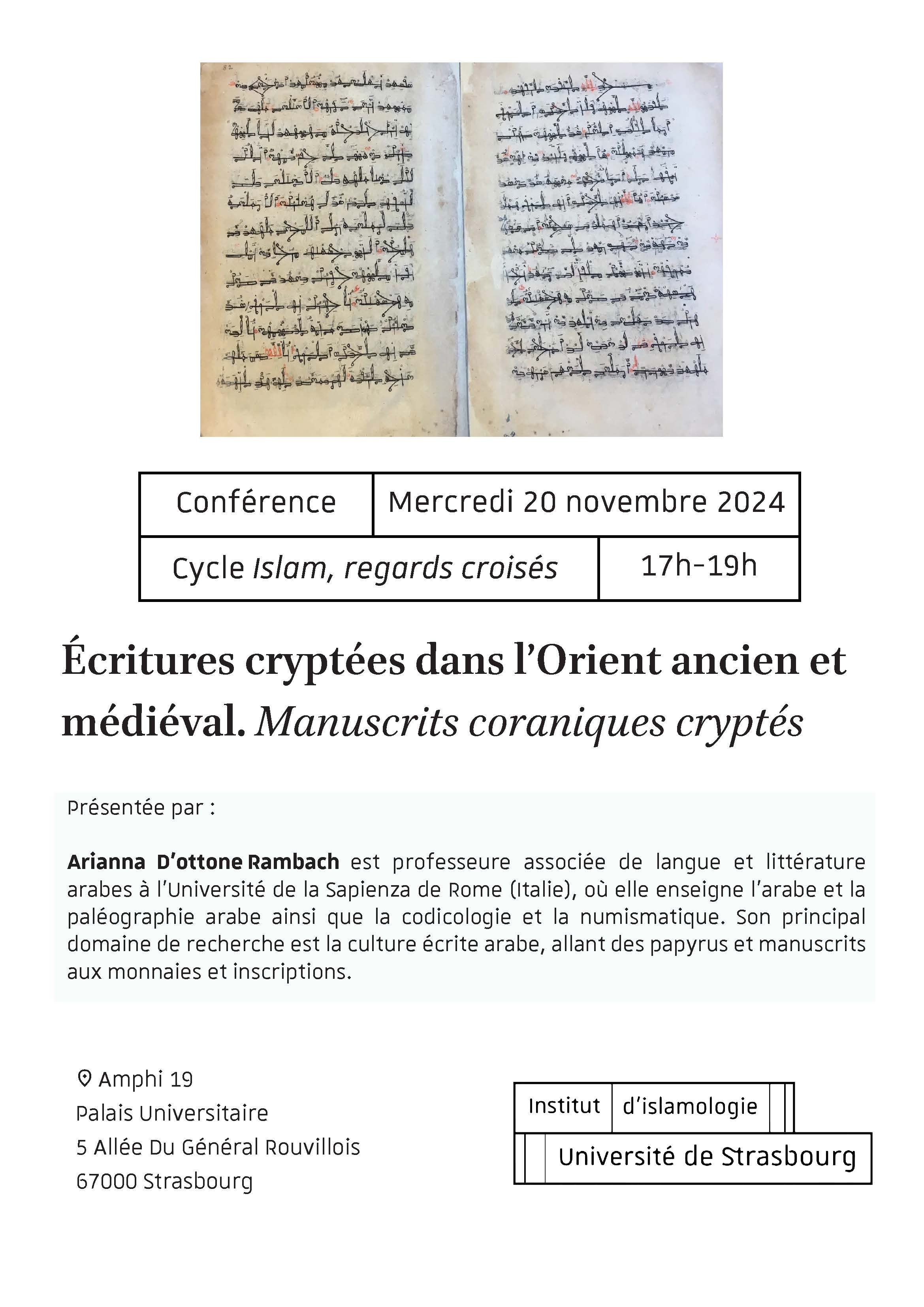 Dans le cadre du cycle de conférences Islam, regards croisés, l'Institut d'islamologie de l'université de Strasbourg organise le mercredi 20 novembre, de 17h à 19h au Palais universitaire, une conférence intitulée : « Écritures cryptées dans l’Orient ancien et médiéval. Manuscrits coraniques cryptés » .