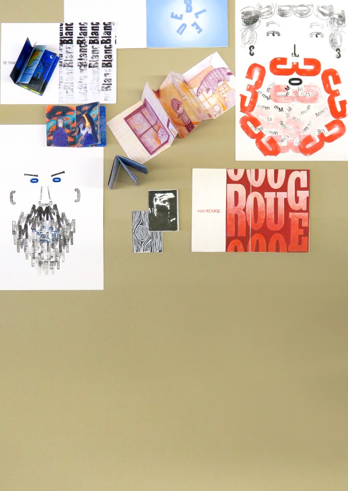 Les expérimentations sur des supports papier de formats variés, tels que l’affiche, le livret, la technique d’impression de caractères typographiques mobiles, la couleur et ses incidences, ont été des moyens d’explorer le