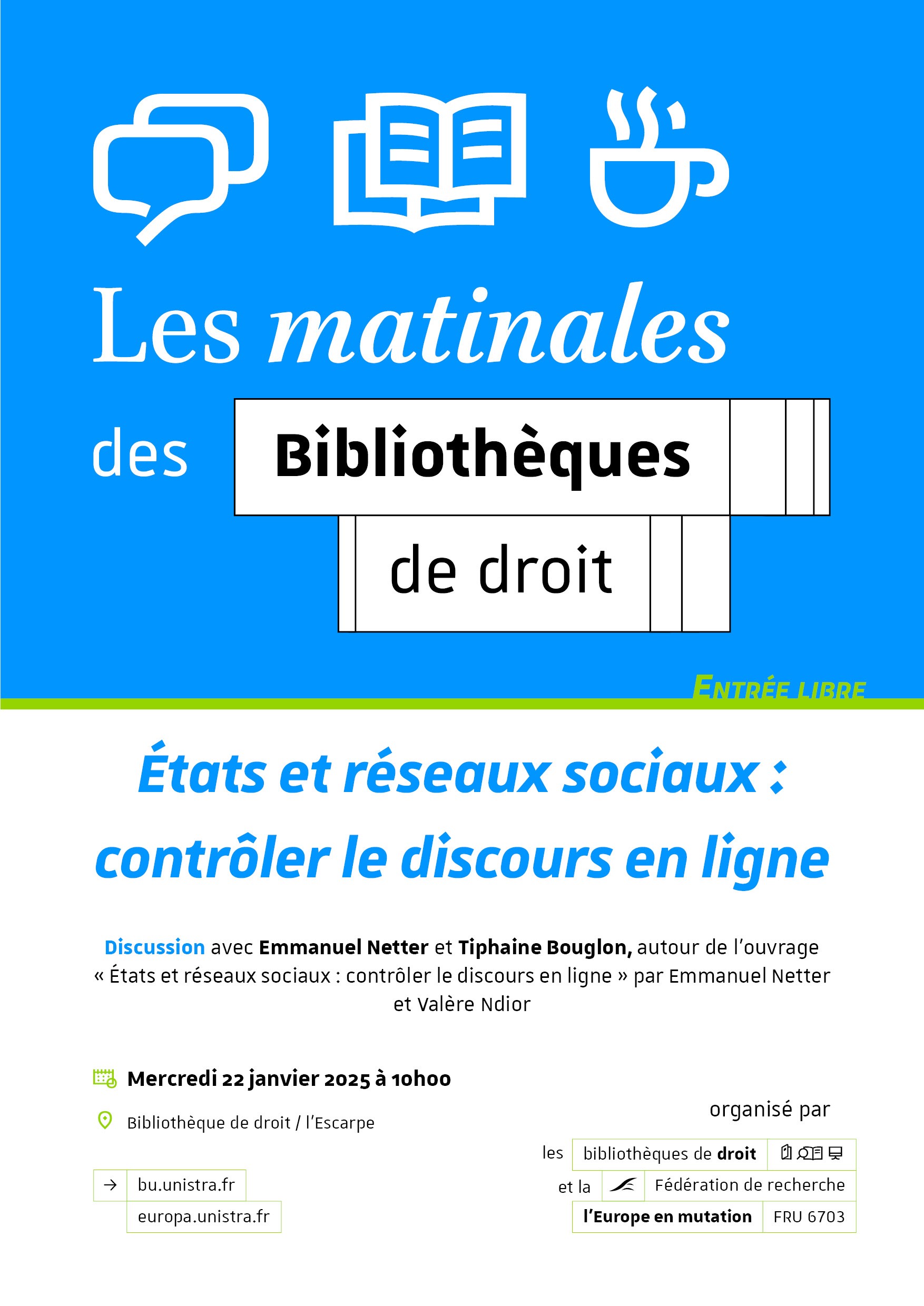 Dans le cadre des Matinales des BU de droit, participez à une discussion avec Emmanuel NETTER et Tiphaine BOUGLON autour de l'ouvrage « Etats et réseaux sociaux : contrôler le discours en ligne » qui aura lieu mercredi 22 janvier à 10h à la bibliothèque de l'Escarpe sur le campus de l'Esplanade de l'Université.