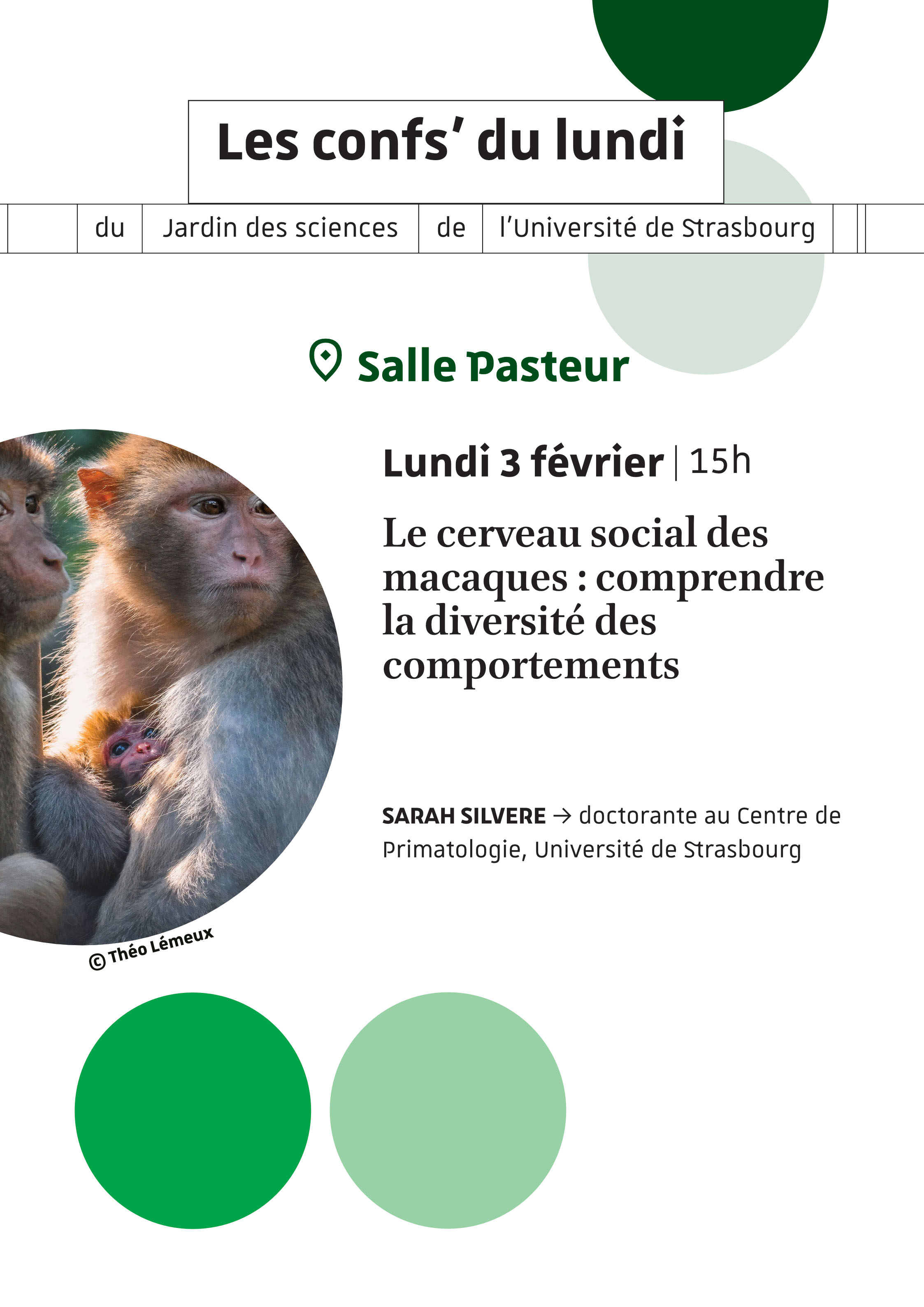 Dans le cadre des Conf' du lundi, une conférence intitulée « Le cerveau social des macaques - comprendre la diversité des comportements » aura lieu lundi 3 février à 15h au Palais universitaire. Elle sera donnée par Sarah Silvère, doctorante au Centre de Primatologie, Université de Strasbourg