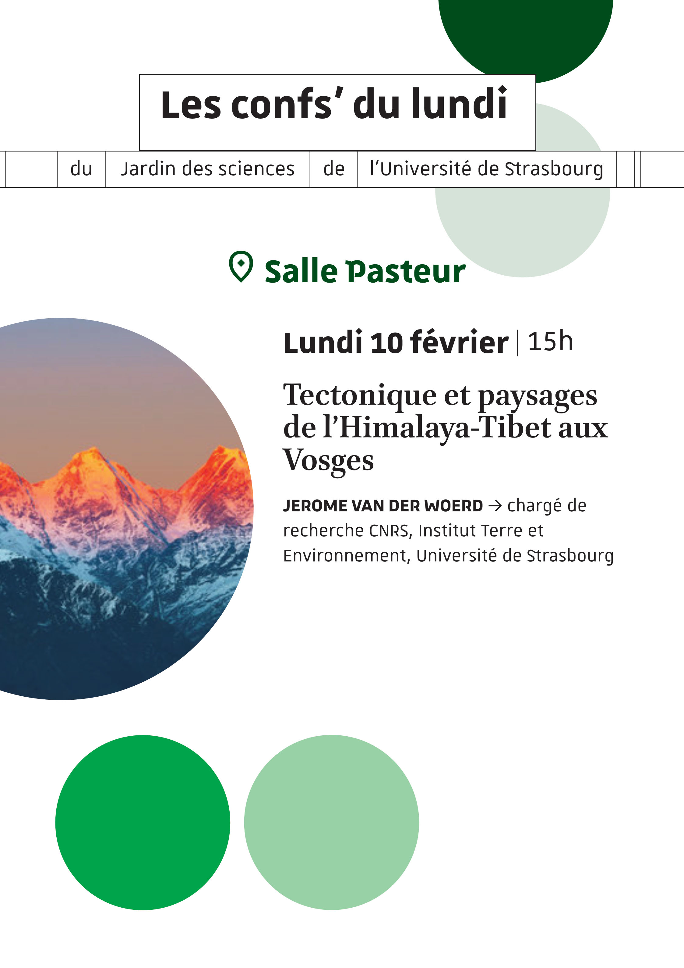 Dans le cadre des Conf' du lundi, une conférence intitulée « Tectonique et paysages de l’Himalaya-Tibet aux Vosges » aura lieu lundi 10 février. Elle sera donnée Jérôme Van Der Woerd, chargé de recherche CNRS, Institut Terre et Environnement, Université de Strasbourg