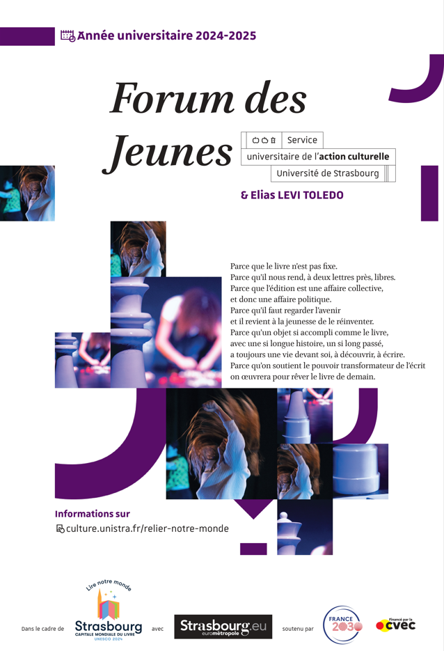 Le Forum des Jeunes intitulé « Passer la littérature au mixeur » aura lieu jeudi 27 février à 17h au Portique sur le campus de l'Esplanade.