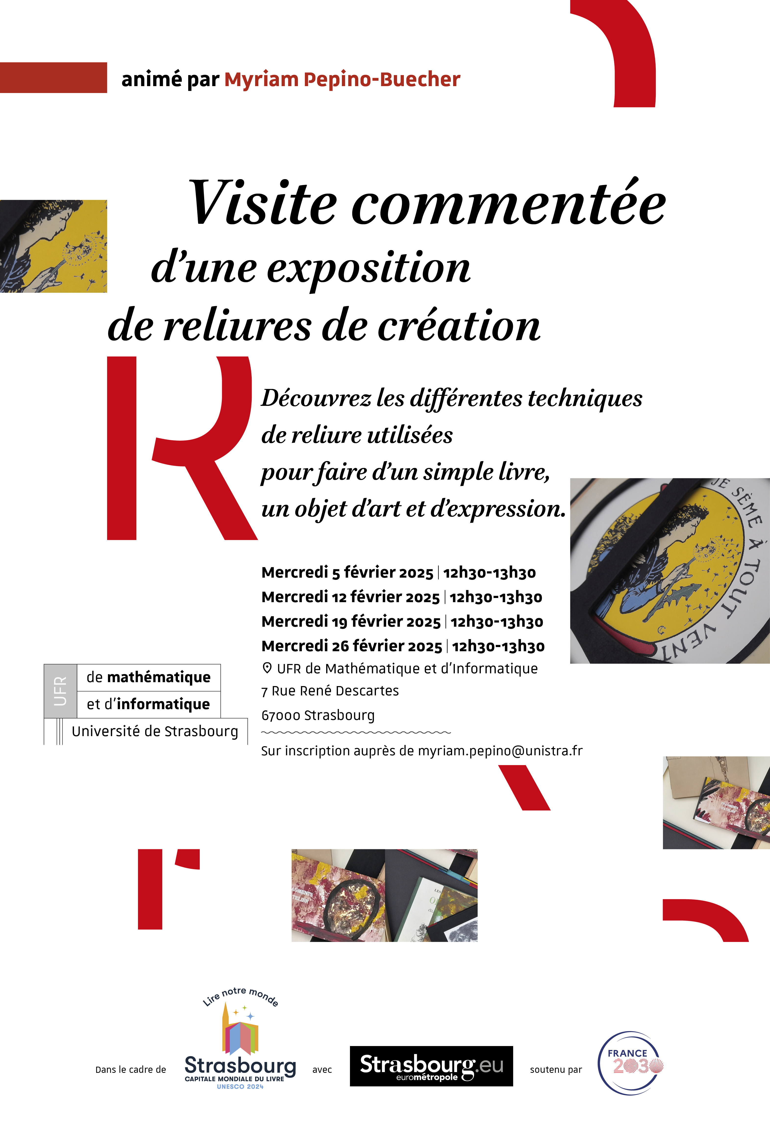 Une visite commentée d’une exposition de reliures de création aura lieu mercredi 5 février à 12h30 à l'UFR de mathématique et informatique sur le campus de l'Esplanade.