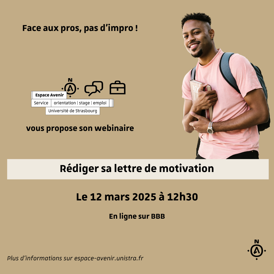 Un webinaire intitulé « Rédiger sa lettre de motivation » aura lieu mercredi 12 mars à 12h30 en ligne.