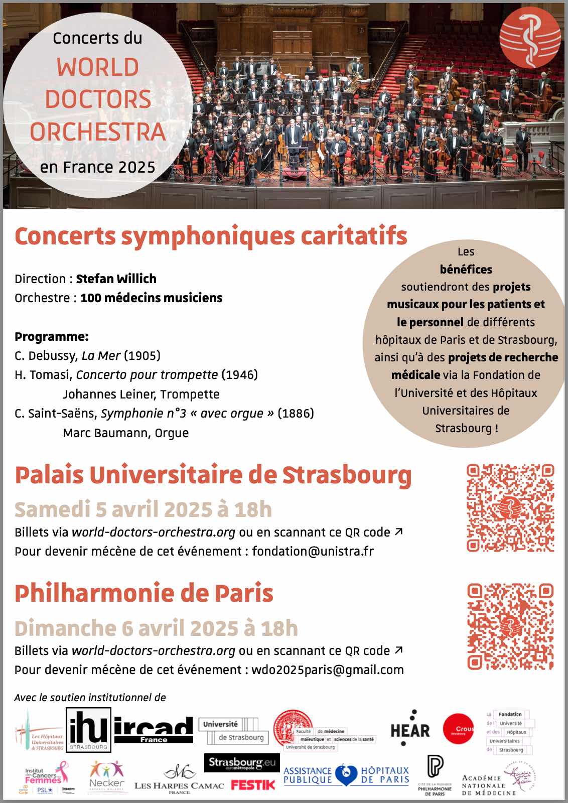 Concerts symphoniques caritatifs sous la direction de Stefan Willich. Les bénéfices soutiendront des projets musicaux pour les patients et le personnel de différents hôpitaux de Paris et de Strasbourg, ainsi qu'à des projets de recherche médicale via la Fondation de l'Université et des Hôpitaux universitaires de Strasbourg.