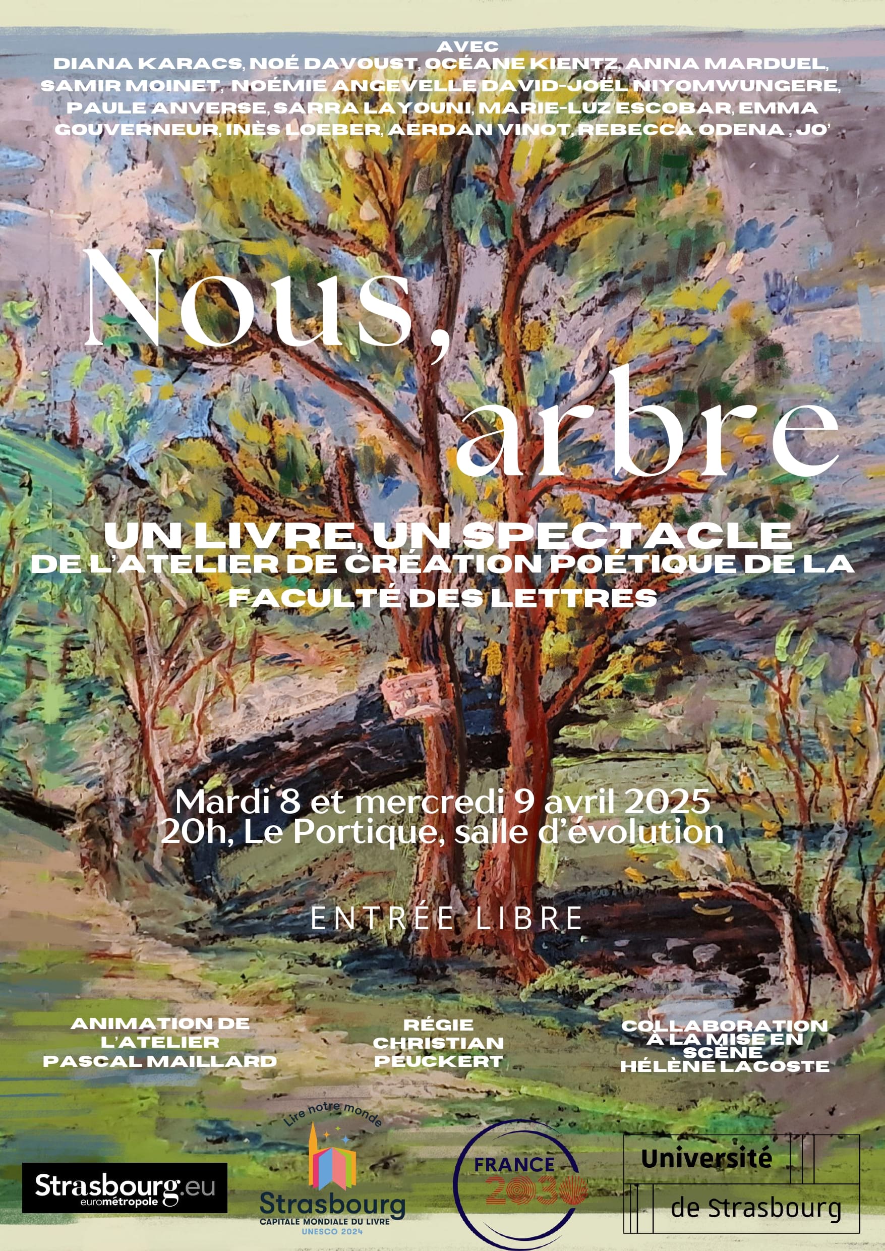 Vous trouverez une présentation du livre sur le site de notre faculté : https://lettres.unistra.fr/actualites/le-livre-nous-arbre-est-sorti/ Il est ensuite un spectacle « ouvert », tout comme le livre, dans la mesure où il intègre des textes écrits par des lectrices et lecteurs du livre, en prolongement de celui-ci. Mais il est également ouvert par la place qu’il accorde aux arts visuels, à la musique et au chant. Il est enfin un spectacle engagé au sens où de nombreux textes manifestent un souci éthique à l’endroit de la préservation de la nature et de la défense des valeurs d’égalité, de parité et de respect de l’autre.
