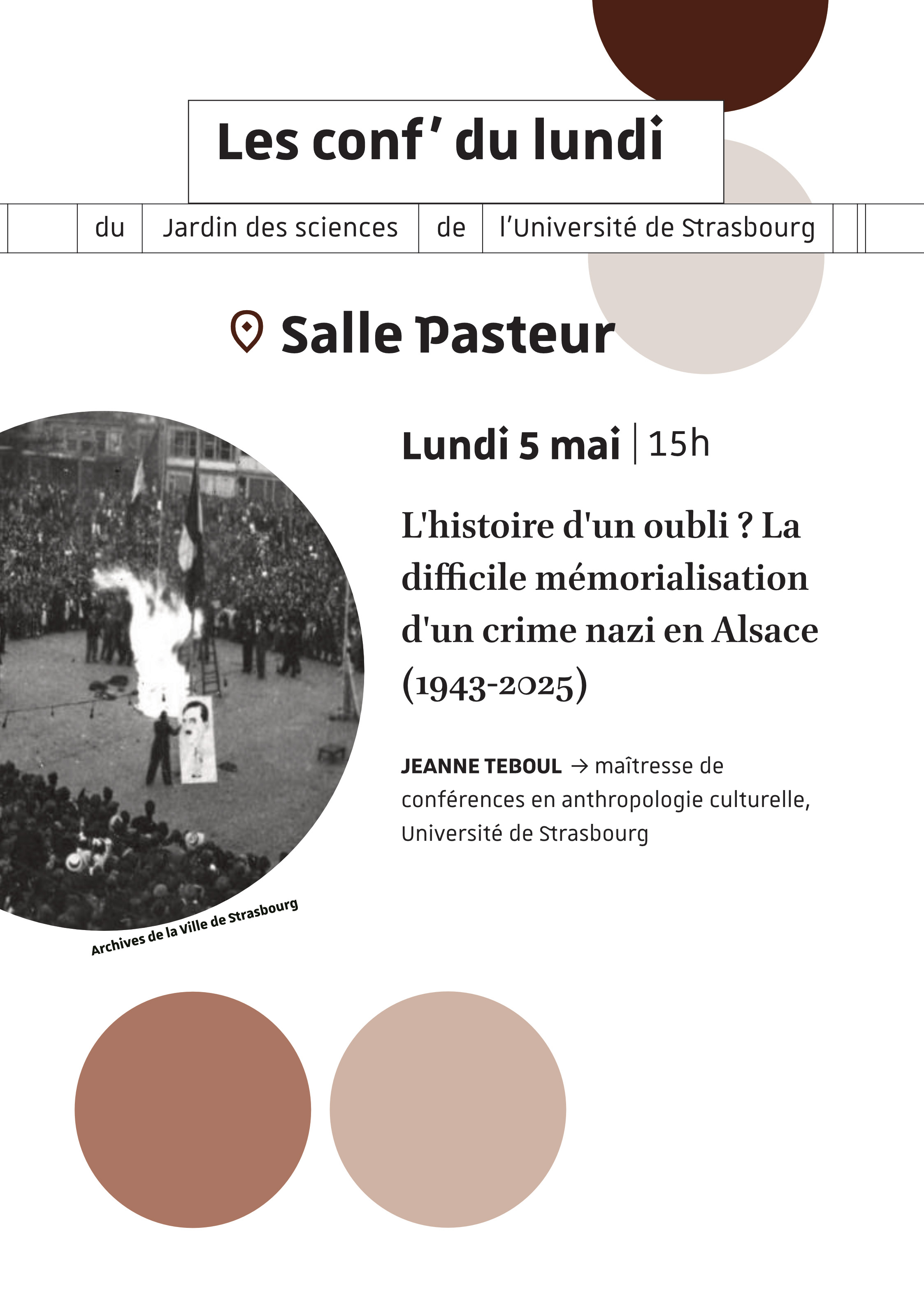 Dans le cadre des Conf' du lundi, une conférence intitulée « L’histoire d’un oubli ? La difficile mémorialisation d’un crime nazi en Alsace (1943-2025) » aura lieu lundi 5 mai à 15h au Palais universitaire. Elle sera donnée par Jeanne TEBOUL, maîtresse de conférences en anthropologie culturelle, Université de Strasbourg.