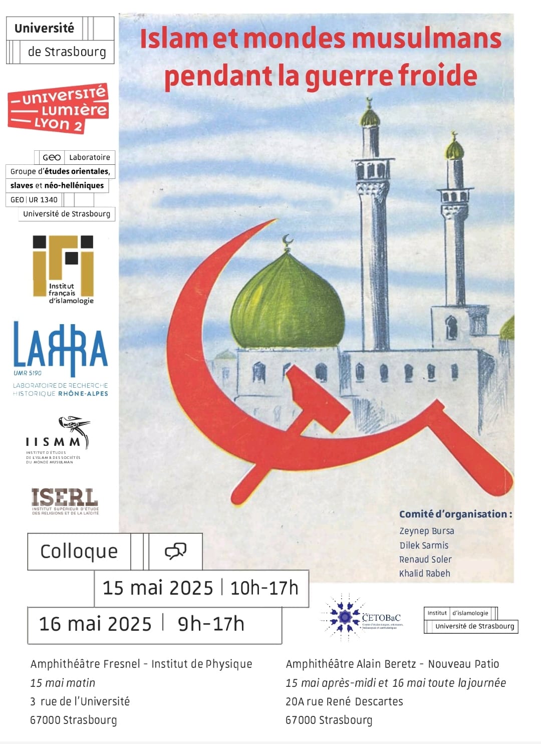 L’université de Strasbourg accueillera le colloque ''Islam et mondes musulmans pendant la guerre froide'', organisé par Zeynep Bursa (MCF Lyon II), Dilek Sarmis (MCF Unistra) et Renaud Soler (MCF Unistra) . Cet événement scientifique réunit plusieurs partenaires académiques : les laboratoires UR GEO et UMR LAHRA, l’Institut français d’islamologie (IFI), l’Institut d’études de l’islam et des sociétés du monde musulman (IISMM), l’Institut supérieur d’étude des religions et de la laïcité (ISERL) et l'Institut d’islamologie de l'université de Strasbourg, ainsi que le Centre d’études turques, ottomanes, balkaniques et centrasiatiques (CETOBaC).