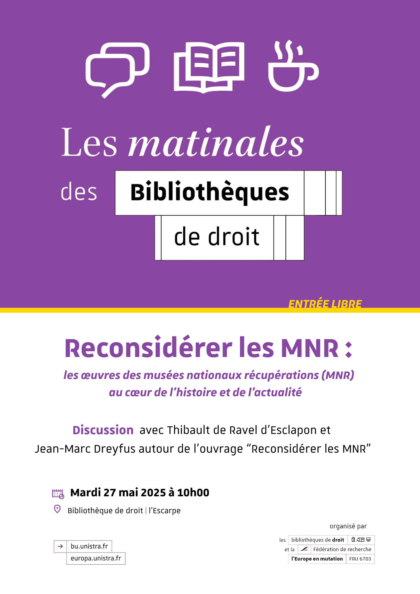 La Matinale de la recherche juridique intitulée « Reconsidérer les MNR : les œuvres des Musées Nationaux Récupération (MNR) au coeur de l'histoire et de l'actualité » aura lieu mardi 27 mai à 10h à la bibliothèque L'Escarpe.