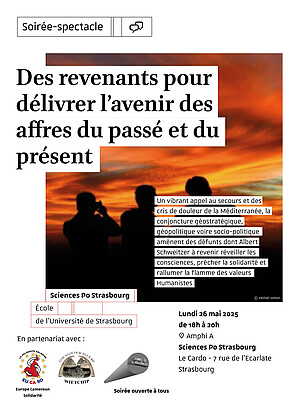 Un vibrant appel au secours et des cris de douleur de la Méditerranée, la conjoncture géostratégique, géopolitique voire socio-politique amènent des défunts dont Albert Schweitzer à revenir réveiller les consciences, prêcher la solidarité et rallumer la flamme des valeurs Humanistes.