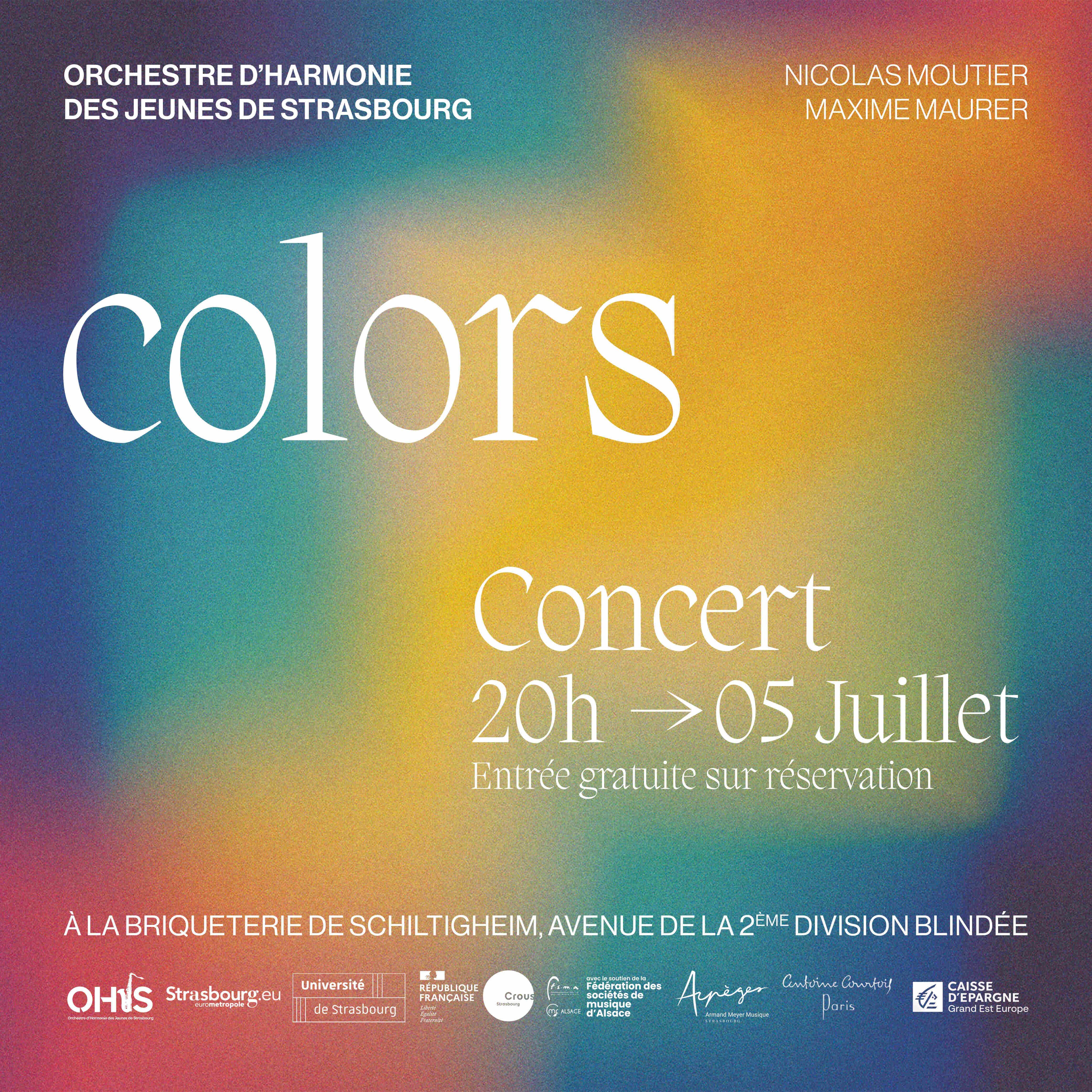 L’Orchestre d’Harmonie des Jeunes de Strasbourg (OHJS) vous donne rendez-vous pour le concert « Colors » samedi 5 juillet à 20h à la Briqueterie de Schiltigheim pour un concert exceptionnel placé sous le signe de la couleur. Cet événement marquera la sortie officielle de leur tout nouveau disque Colors, fruit d’un travail intense et passionné, enregistré en novembre dernier.