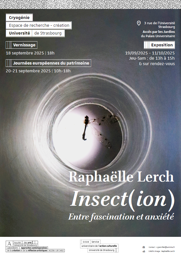 L'exposition de Raphaëlle Lerch intitulée « Insect(ion) : Entre fascination et anxiété » aura lieu du 19 septembre au 11 octobre 2025, du jeudi au samedi, de 13h à 15h à l'espace de recherche-création « Cryogénie » sur le campus historique.