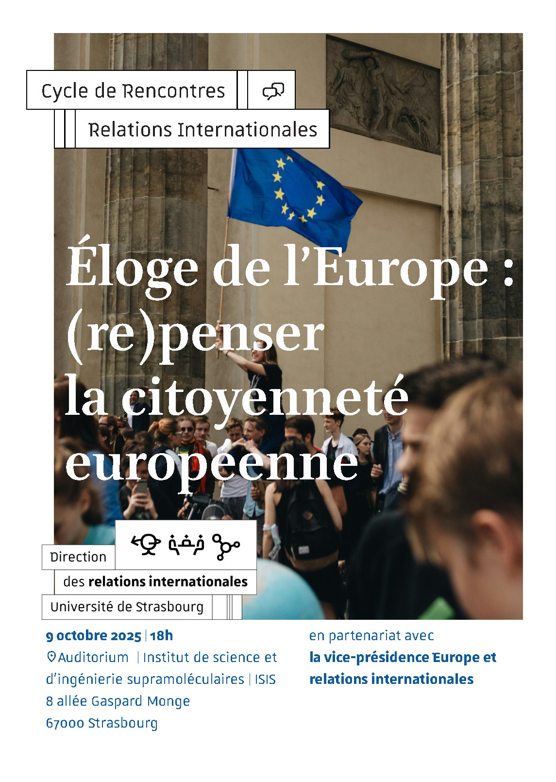 En compagnie de nos invités, nous explorerons le concept de citoyenneté européenne, en interrogeant ses fondements culturels et humanistes, l’évolution des démocraties en Europe et de nos valeurs communes, la solidarité entre États et citoyens européens et la participation renouvelée de ces derniers au débat démocratique.L’Université de Strasbourg bénéficie d’un positionnement unique : implantée au cœur de Strasbourg, capitale européenne et siège de nombreuses institutions, elle dispose d’un environnement exceptionnel pour développer des synergies, valoriser son expertise et s’affirmer comme un acteur académique majeur du projet européen.La Direction des relations internationales joue un rôle moteur dans cette ambition. En puisant l’expertise dans l’écosystème académique, politique, culturel et administratif, ce Cycle de Rencontres Relations Internationales a pour vocation d’ouvrir des espaces de réflexion et de sensibilisation, à la fois pour la communauté universitaire et pour la société civile, aux enjeux européens et internationaux.Avec :