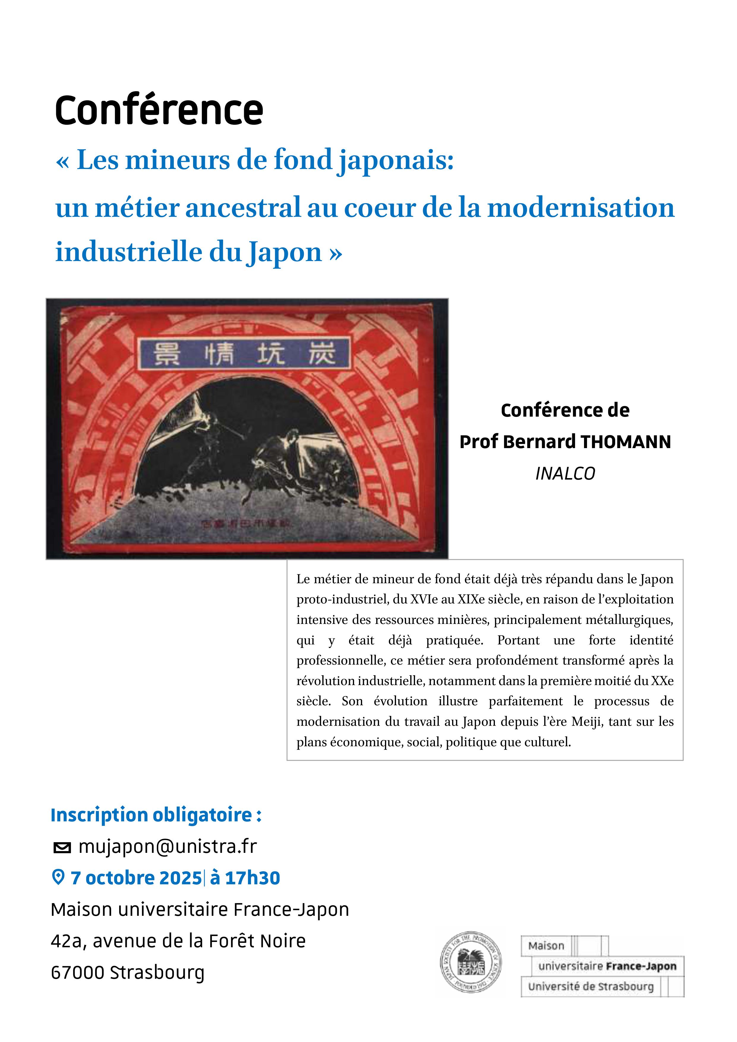 La Maison Universitaire France-Japon, en collaboration avec The Japan Society for the Promotion of Science (JSPS), a le plaisir de vous convier à la conférence intitulée « Les mineurs de fond japonais: un métier ancestral au coeur de la modernisation industrielle du Japon » qui aura lieu mardi 7 octobre à 18h30 à la Maison France Japon. Elle sera donnée par le Prof Bernard Thomann, Institut National des Langues et Civilisations Orientales (INALCO), Département d’études japonaises.